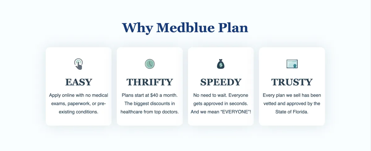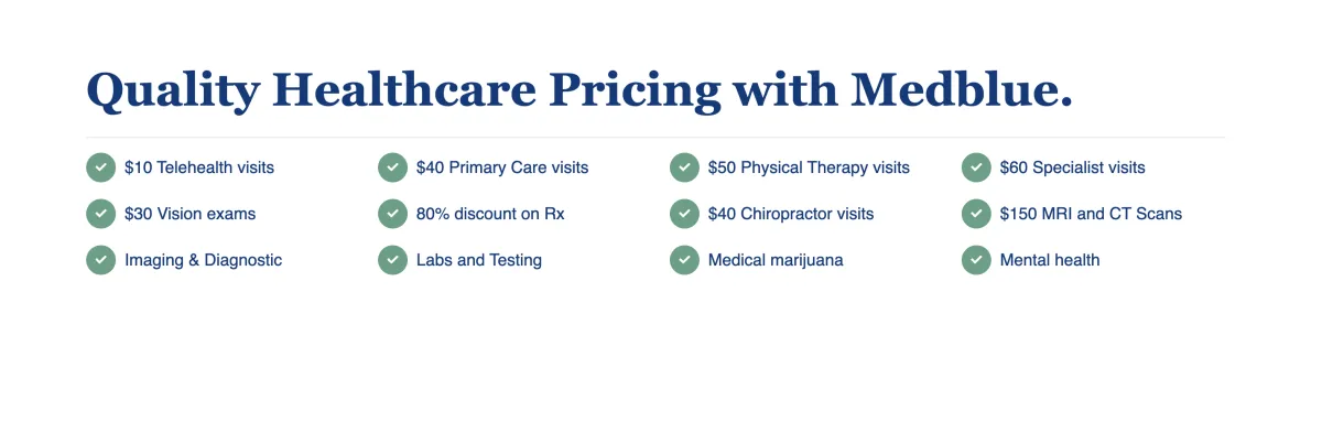 At Medblue, we see the need for affordable healthcare and make discounts accessible to everyone. You’ll know the price of care, never receive surprise bills, and won’t get trapped with long-term commitments.